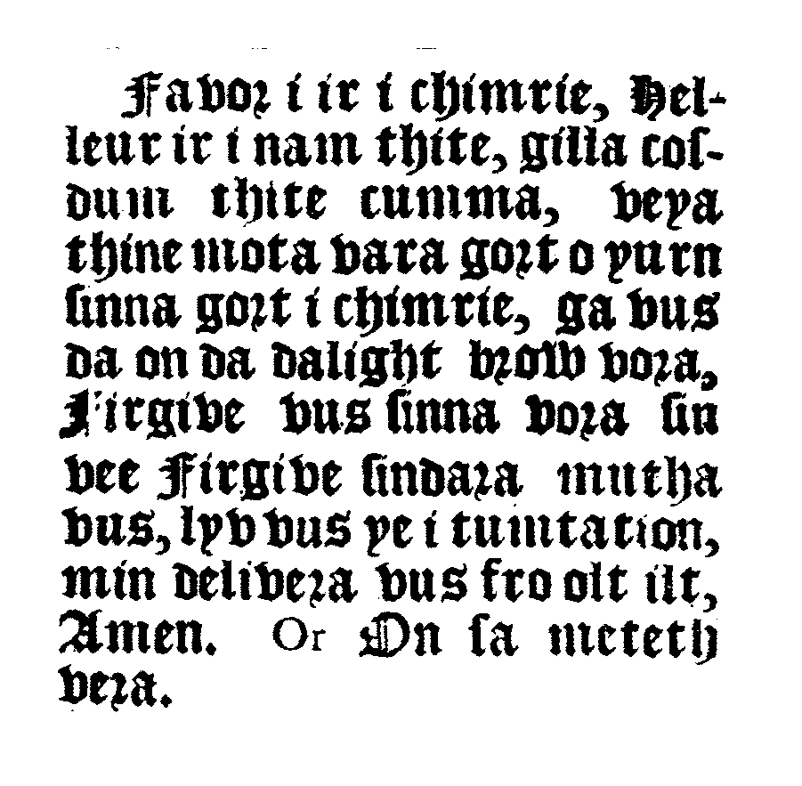We do have two snippets of Orkney Norn from the time when it can be supposed still to have been the language of the majority or at least of part of the population. One “Jo Ben” writing sometime in the 1500s, notes that “when we say ‘Guid day Guidman’, they [the islanders] say ‘goand da boundæ’”. The Norn phrase corresponds closely to Faroese and Icelandic góðan dag, bóndi, a circumstance which suggests that the grammatical system of Norn in the sixteenth century still retained much of its Old Norse flavour. A longer piece of Orkney Norn is a version of the Lord’s Prayer, which appeared in printed form in 1700 (see accompanying illustration). This is still recognisably Scandinavian, but bears witness to a collapse of the Old Norse grammatical system, and the admixture of elements from Danish and Scots.