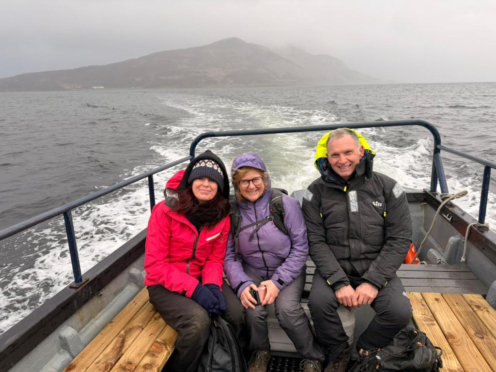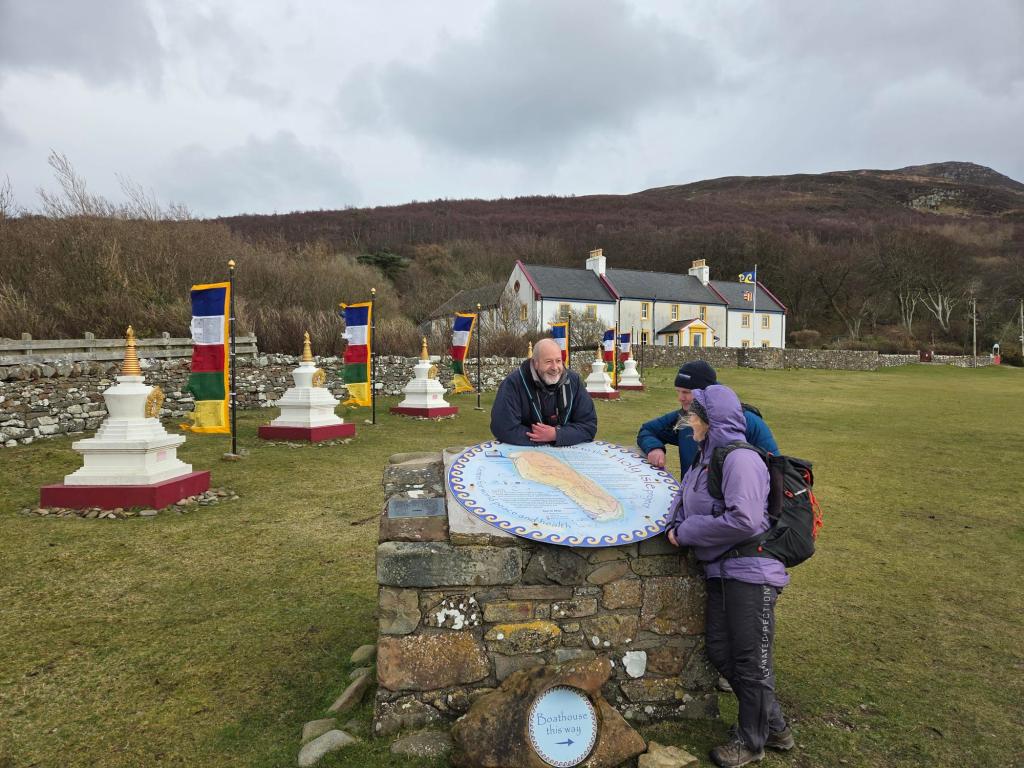 Main image shows Alex, Grant (Lamlash Cruises) and Caroline at the Buddhist monastery on Holy Isle, Arran.